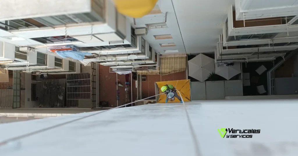 Operario de Verticales y Servicios realizando trabajos de rehabilitación de patio de luces en comunidad de propietarios.
